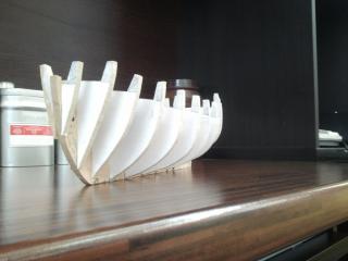 Din ce vad eu in poze,nu imi place nimic.Nici macar o piesa nu este finisata,toate baghetele sint "scamosate". Stilpisorii ccare sustin bordajul de la nivelul puntii in sus,mi se par foarte grosi,si tot nefinisati.La fel bagheta ce ai pus-o pe ei ,nu este o linie regulata si este cam ondulata.Eu inteleg lipsa sculelor,dar ce am criticatr eu mai sus nu necesita decit niste bucatele de lemn cu smirghel de diferite granulatii lipite pe ele