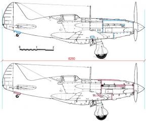 Legat de diferentele de variante si de kitul tau de conversie: arata cam ciudat fantele alea 6 de aerisire din kitul de conversie, in realitate si la modelul Trumpeter 1/48 early ele apar mai adanci si mai putin extinse spre dreapta - poate e doar o impresie. Atasez o poza sa te edifici. Aripa de early nu are voleti pe bordul e fuga si are 2 capace pe fiecare extrados de aripa in zona de lemn si un capac dreptunghilar in aceiasi zona pe intrados (vezi poze). Tubul Pitot e iarasi diferit, la early pleaca direct din bordul de atac al aripii nu e dedesubt. Migul venit la noi era vopsit inainte de razboi in standardul AII Green, AII Blue cu 6 stele: 2 extrados, 2 intrados, 2 fuselaj dar care dupa modificarea standardului a primit inca 2 stele pe deriva precum si un nr tactic vopsit din pensula si cu o alta nuanta de rosu. Pe majoritatea aparatelor early (in afara de cele noi) se vad evidente diferente de verde intre zonele de lemn si cele de metal, mai deschis pe metal si mai inchis pe lemn. Nu am gasit poze sau alte evidente care sa ateste ca s-a intamplat la fel si cu albastrul de pe intrados, ma gandesc ca era mai putin expus la soare intradosul. Schema cu maro nu cred ca e veridica, avionul se vede din poze ca era destul de murdar si uzat cu dare de ulei/fum in spatele fantelor dar in afara de zonele unde au dat romanii cu verde nu cred ca apare vreun maro acolo. La noi s-au acoperit stelele de pe fuselaj si deriva cu verde si stelele de pe aripi atat pe extrados cat si pe intrados cu galben. Destul de atipic galbenul pe extrados cat si faptul ca vrānd sa acopere stelele s-a mers cu galbenul destul de mult fata de alte aparate. Noroc ca rusii aveau stelele mult in exterior ca poate vopeau ai nostrii juma de aripa galbena. Crucile sunt si ele atipice, nu au alb la exterior si par mai subtiri din cauza asta. Radu Dan spune ca aparatul a venit cu radio care a fost luat de servicile de ascultare a armatei, din pozele facute cu aparatul dupa dezertare nu poti sa-ti dai seama daca are radio sau nu. Se vede catargul dar nu se vede vreu fir sau vreun izolator pe linia firului antenei. Oricum in pozele cu Bāzu calare pe MiG se vede clar ca nu mai exista radio. In faza de inceput radiourile nu erau frecvente si de multe ori numai comandantul avea radio. Ca o ciudatenie aparatul desi era early are inelul metalic dintre elice si fuselaj specific aparatelor late.