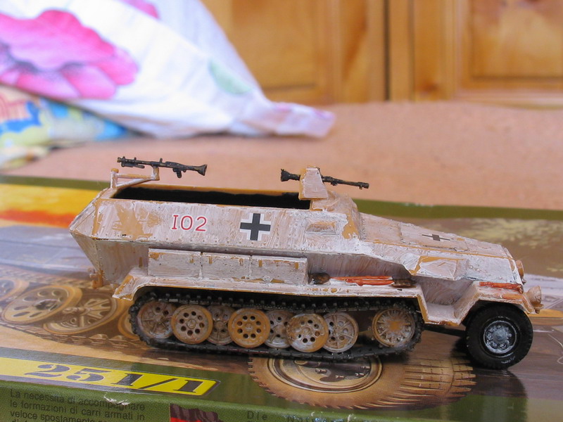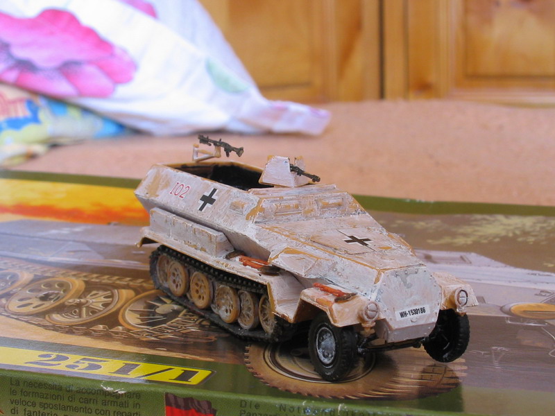 1. In primul rand este vorba de un sdkfz 251/1 ausf C (sasiu nituit, sau mi se pare mie?) si nu de sdkfz 250. Spre deosebire de 251, care avea la baza tractorul de 3t sdkfz 11, 250 avea la baza tractorul de 1t, si era sensibil mai mic.