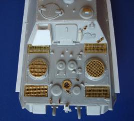 Dupa, am mai ciufulit putin la cald aripile din fata, lucru la care producatorul a avut ideea sa la faca subtiri si bine detaliate, am montat din culee trasa cei 4 suporti de cabluri pe lateral, am refaut cordonul de sudura la capacul cazematei (acolo din productie fiind lasat doar spatiu gol) si am garvat jumatatea capacelor.