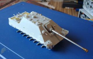 Povestea acestei machete incepe intr-o zi cand am decis sa cumpar un Jagdpanther de la Trumpeter pentru piese, in special sculele si senilele de rezerva care sunt foarte bine detaliate. Canibalizand acele piese am inceput sa descopar frumusetea si corectitudinea acestui Kit. Dupa cateva masuratori si placut impresionat de formele sale, am decis fara tagada sa-i dau o sansa acestui "mic chinez", acum fara scule pe lateral si fara senile de rezerva.