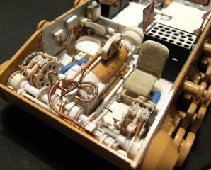 Cam asta a fost lucrul afectat respectivei zone. Urmand traseul cablurilor (spre fata, in vederea aducerii curentului necesar la convertoare si de la ele la statiile radio, consolele dreapta [radist], consola stanga [mecanic conductor] si binenteles pe coloana centrala pana la consola/ramificatie pentru turela, am decis sa trisez putin -desi nu mi-a suras ideea, pentru a prinde putina viteza de lucru.