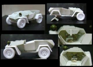 Dupa ce am dat un strat de email pe Sdkfz, m-am gandit ca n-ar strica , pana se " matureaza " vopseaua sa-mi fac putin de lucru cu ce am gasit mai la indemana , pe " linga casa " .Micutul Ba 64 , nu a reusit sa se ascunda la timp si l-am insfacat de " nasuc " .Nu degeaba era recunoscut in epoca pentru lentoarea sa datorata blindajului prea greu raportat la cat putea sa traga sarmanu-i motoras Ford ( 4 cilindri?) .Asadar , am dat "cep" versiunii rusesti a cunoscutului vehicol de recunoastere german si in ultima saptamana ... " l-am dat peste cap" .Am ales sa reprezint acea cunoscuta si inedita masina modificata in teren in vehicol de comandament fotografiat prin "Bogashany town " ,undeva imediat dupa 23 august .Am pilit ( cu ghilimele sau nu ), slefuit , construit panou parafoc , "bucatica " motor ( cu chitibusurile aferente ), pedale , panou de bord , inlocuit de portiere ,etc , .Nu sint pe deplin satisfacut de rezultat , dar m-am simtit tare bine construindu-l , acesta fiind si primul meu kit unde m-am " bagat " mai serios la " converteala" . Inainte de-a va lasa in compania fotografiilor de epoca a masinii reale , precum si a primelor poze " shpion " ale modelului , pohtesc a va adresa si o intrebare :---------------------- Eu am ( cica)un Ba -64 B , iar in legenda fotografiei se specifica cum ca la baza vehicolului real ar fi un Ba-64 -125 . Cunoasteti care ar fi diferentele intre cele 2 versiuni? ------------ P.S. Anumite piese nu sint lipite permanent ,doar in puncte , pentru a -i deslusi forma in mare . Farul provine de la un Valentine ( distrus cu mult timp in urma , dar pe care planuiesc sa-l recuperez candva ) . Cum dimensiunea farului corespunde destul de mult cu cee ce este dat in kit , cred ca-l voi utiliza , dupa modificarile cuvenite .