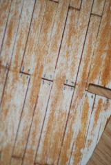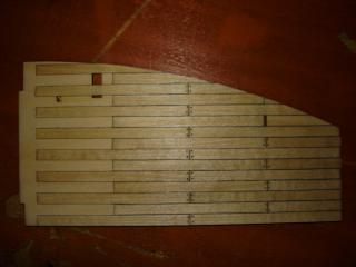 Cam asa arata jumatea de punte de la primul numar al revistei, 2 poze sunt facute peste o alta punte din alt lemn care arata mai bine dupa parerea mea. Puntea cu materialul dat in revista e prea alba si asta cu toate ca am dat-o cu ulei de in, apropo Crios, cam acelasi rezultat se obtine si cu lac mat si am impresia ca sunt un pic cam late scandurile puntii. De observat diferenta fata de instructiuni. Oricum asta a fost pentru experiment si exemplificare pentru ca eu am sa constriesc nava cu bordajul inchis si aceasta punte nu se vede.