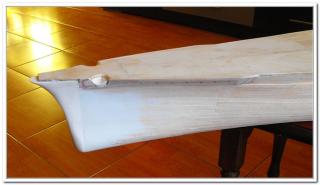 Acestea fiind spuse, am o problema. Tocmai am terminat al doilea strat de bordaj, am montata etrava de rasina si am observat ca am cam facut o gafa; cred ca am slefuit prea mult primul strat, si piesa de rasina iasa in afara bordajului cu ~1 mm.
