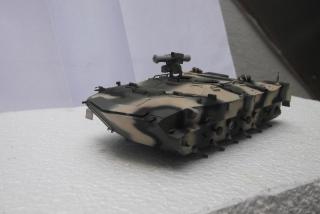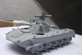 -cand am facut documentarea despre BMD-1 am gasit la variante ca se prevedea o modernizare a acestui blindat prin ilocuirea turelei ce o avea cu noua turela "kliver " aparuta in contextul aparitiei multor firme de tehnica si tehnologie militara de larusi ce luptau pt castigarea de contracte cu armata , astfel ca respectiva turela moderna ce avea un tun de 30mm si o rampasuport pt 4 rachete AT ce avea sa fie deservita de un singur servant datorita automatizarii si aparaturii de observare/dirijare era gandita pt a ilocuii vechile turele de BMP-1 si BMD-1 ba chiar pt echiparea unei variante de BTR-80 , modernizarea nu s-a facut; totusi pt ca am aflat de acest proiect si pt ca firma SP Designs a scos pe piata o astfel de turela m-am pus sa o aplic intr-o macheta si astfel un sasiu de BMD-1 de la Alanger si la care am aplicat o placasuport/inel pt turela din rasina dar tunul era turnat dintr-o bucata astfel ca s-a confectionat altul din 3 bare din sarma unite de 3inele de lungul acestui cadru in forma de triunghi si prin care a tracut teava de tun tot din sarma dar avand la capat un manson si pri mansonul repectiv teava de tun din ac de seringa